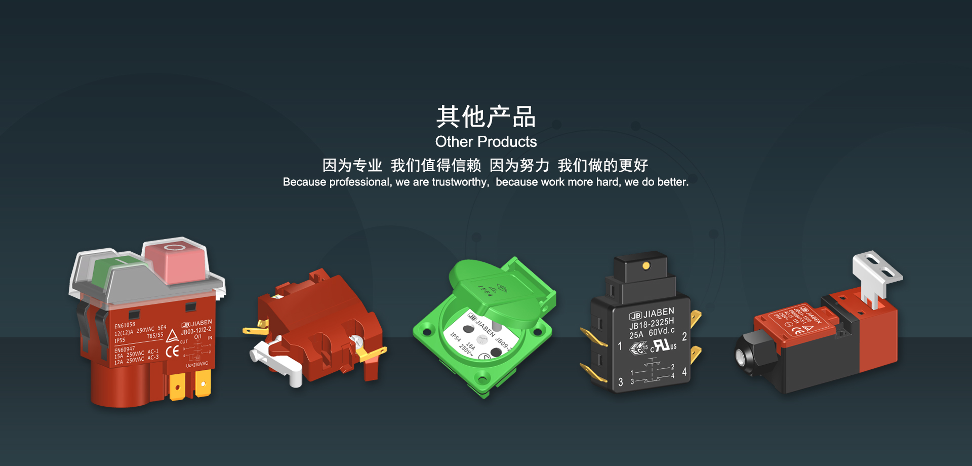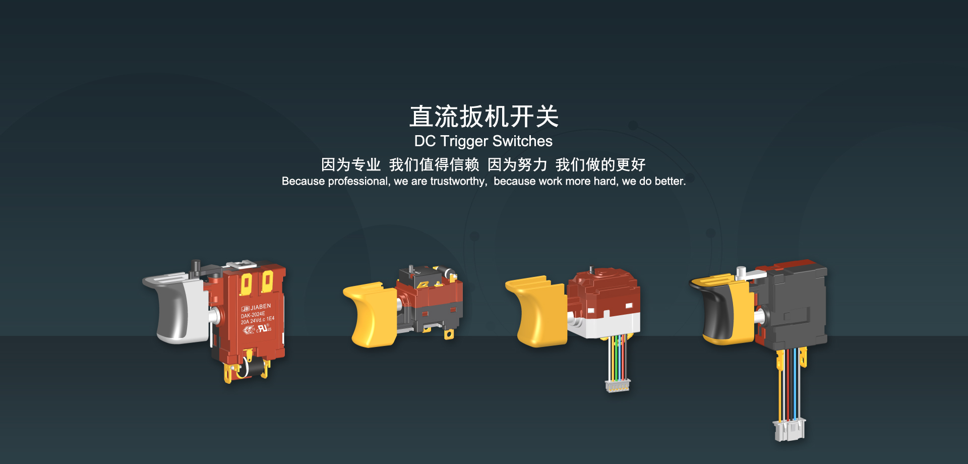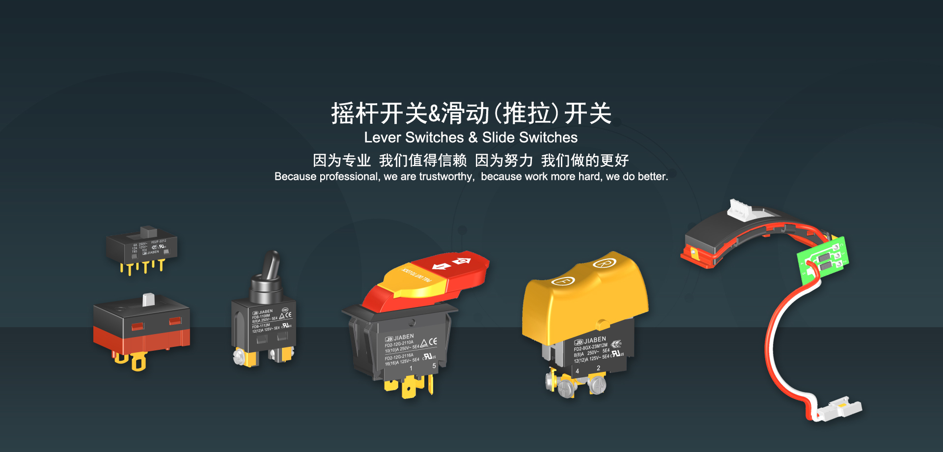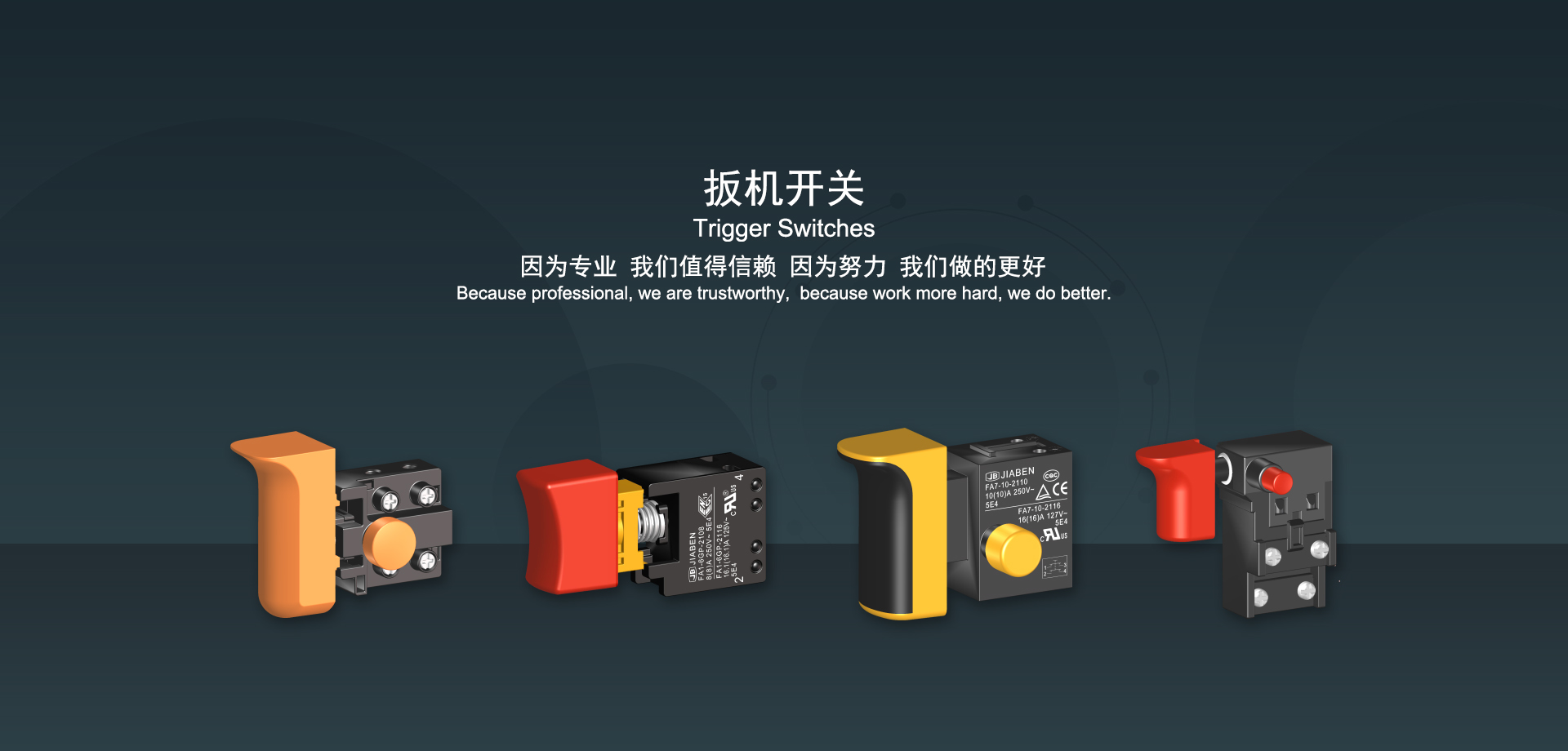 浙江佳奔電子有限公司始建于1986年,坐落于浙江省樂(lè)清市虹橋鎮(zhèn)東電子信息產(chǎn)業(yè)園內(nèi),現(xiàn)有職工700多人,資產(chǎn)總額超3億元。公司主要經(jīng)營(yíng)“JIABEN”牌微動(dòng)開(kāi)關(guān)、蹺板開(kāi)關(guān)、按鈕開(kāi)關(guān)、扳機(jī)開(kāi)關(guān)、調(diào)速開(kāi)關(guān)和電位器開(kāi)關(guān)等各類(lèi)交、直流器具開(kāi)關(guān)和各類(lèi)交、直流線路板模塊等產(chǎn)品,主要應(yīng)用于交、直流電動(dòng)工具、電動(dòng)園林工具、清潔器具、家用電器和小型機(jī)床等行業(yè),是集產(chǎn)品設(shè)計(jì)、研發(fā)、制造、銷(xiāo)售和服務(wù)于一體的國(guó)家高新技術(shù)企業(yè)。JIABEN was founded in 1986, located in East Electronic Information Industry Park, Hongqiao Town, Yueqing City, Zhejiang Proviance, existing staff more than 700 peoples, more than 300 million RMB worth of assets. Company is mainly engaged in "JIABEN" brand Micro Switch, Rocker Switch, Push-button Switch, Trigger Switch, Speed Regulating Switch, Potentiometer Switch and other kinds of appliance switch and all kinds of AC or DC circuit board module, such as more than 100 series, 8000 kinds of models of products, mainly used in AC or DC Power-tools, Power Gardening Tools, Cleaning Appliances, Household Appliances and Small Machine Tool and other industries, is the collection product design, research and development, manufacturing, sales and service in one of the national high and new technology enterprise.